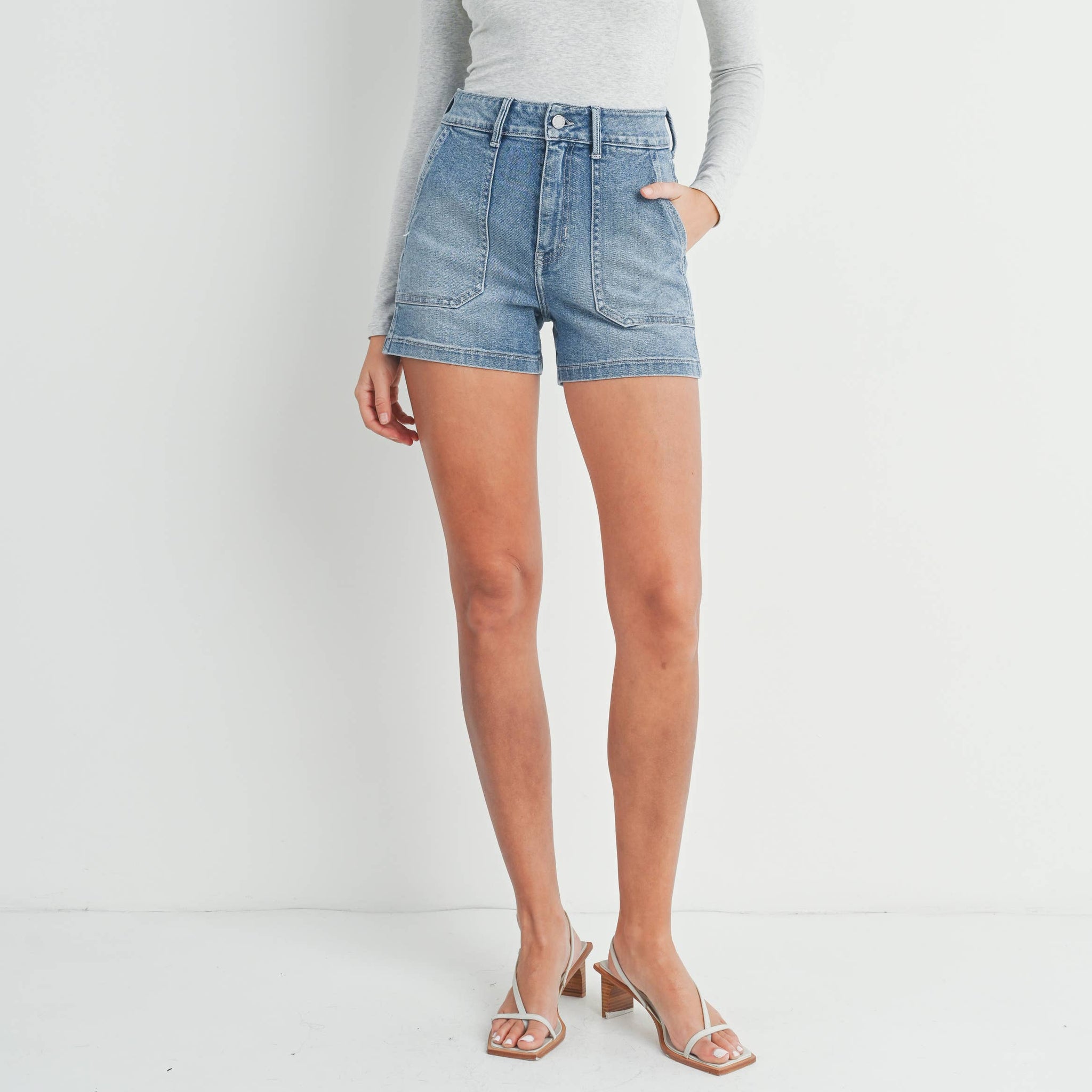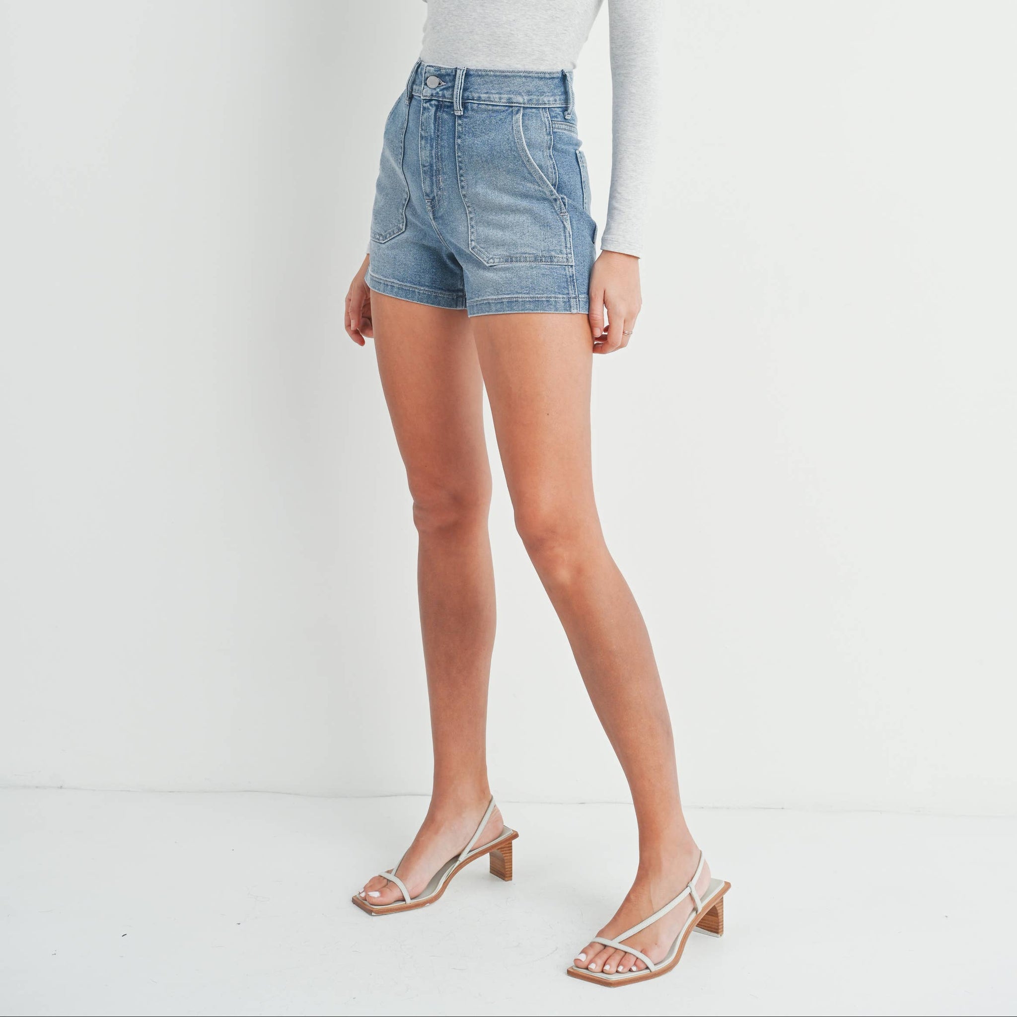 The Utility Short Inspired by vintage workwear, the Utility Short has a high rise, an A-line shape with an eye catching patch pocket detail. Pair that with our comfiest fabric, and you have an easy and cool short perfect for any summertime look 12" Rise, 3.5" Inseam, 12" Opening Light Denim - High Rise
