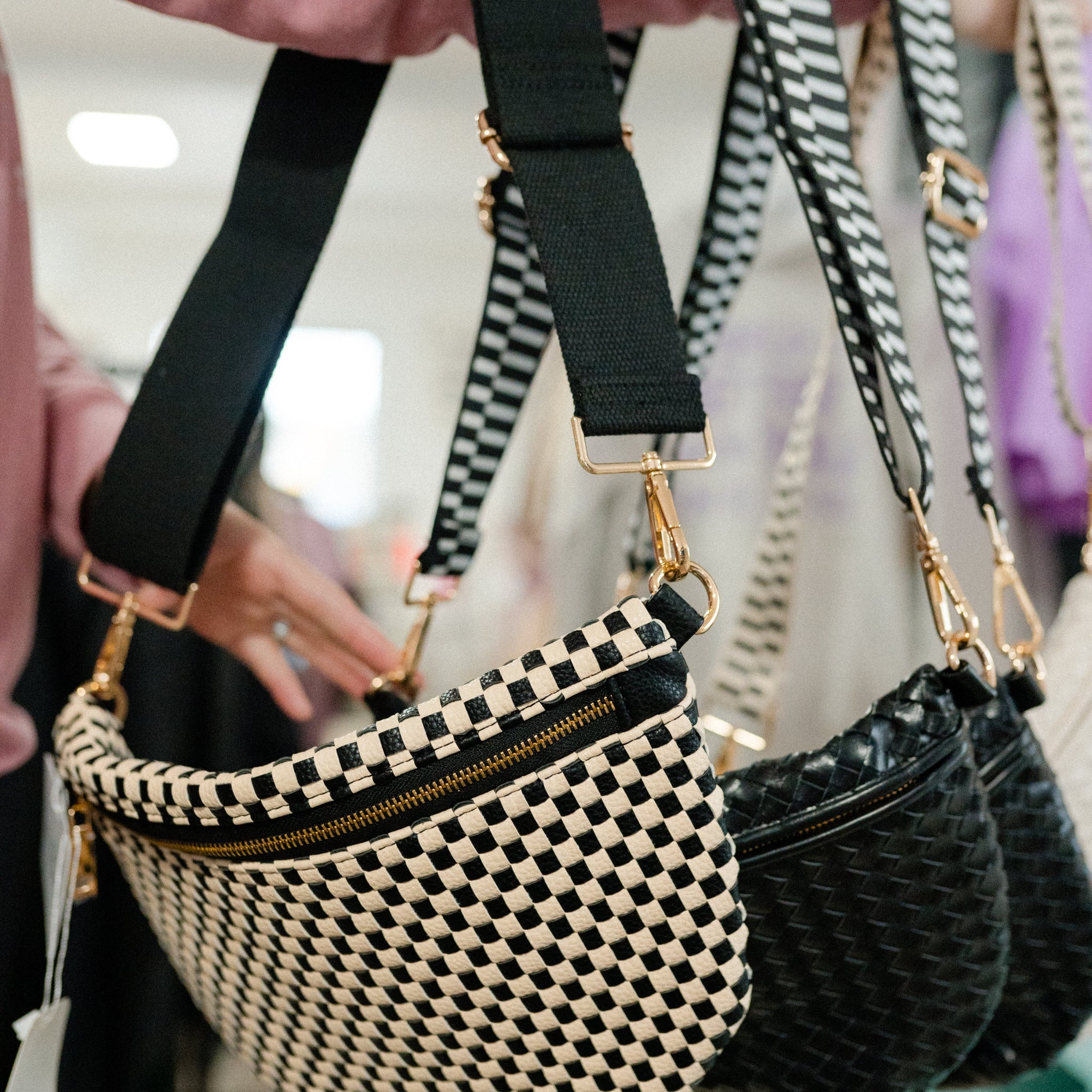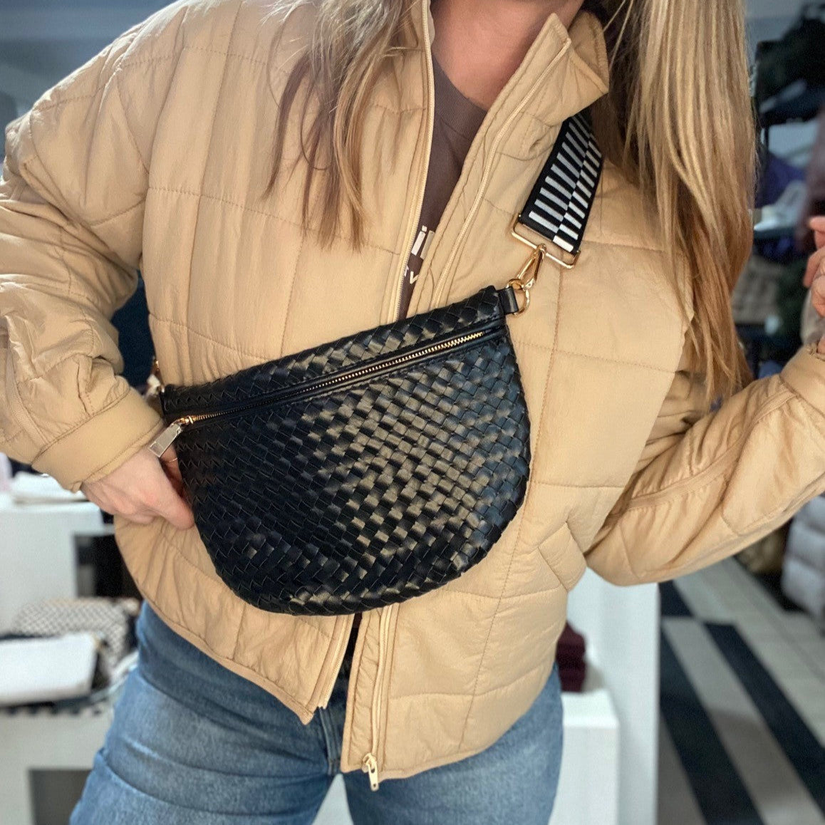 Meet the Westlyn Woven Bum Bag! Gorgeous woven vegan leather in brown, black, cream, checkered black, checkered brown, or checkered tan with a unique block design on the strap gives us edgy, rocker vibes. Beautiful hardware with a zipper closure with beige and black chevron interior, and a zippered slash pocket on the inside. This crossbody bag is the perfect accessory to elevate any outfit! Measurements: 12"L x 8"H x 24"-46" strap Material: Vegan Leather